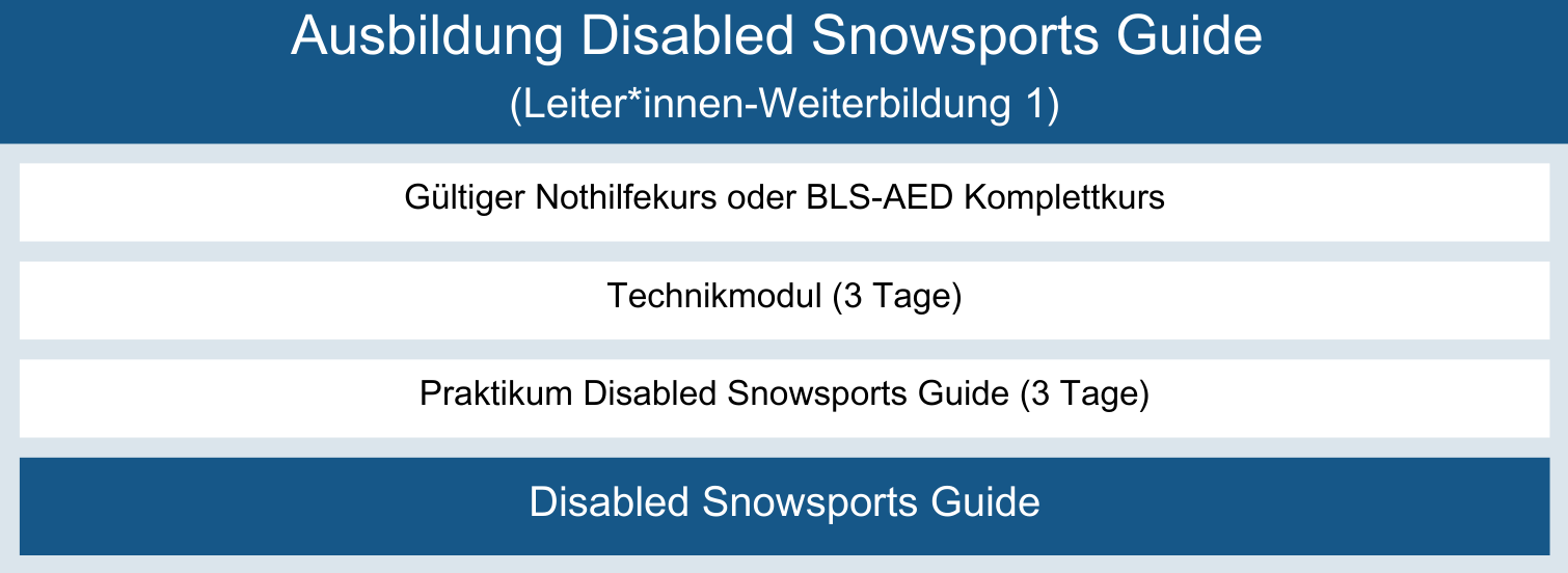 Dauer: 3 Tage (2 Tage in Begleitung eines Disabled Snowsports Specialist, 1 Tag in Begleitung eines*einer Praxisbegleiter*in mit Überprüfung der Austrittskompetenzen)Zulassung: