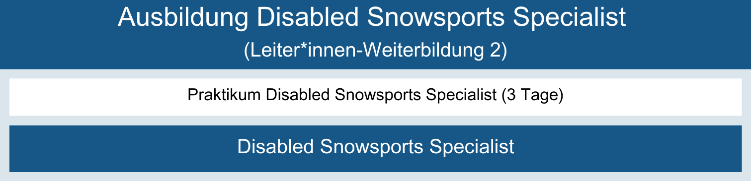 Dauer: 3 Tage (2 Tage in Begleitung eines*einer Praxisbegleiter*in, 1 Tag in Begleitung eines*einer Expert*in mit Erfüllen der Austrittskompetenzen)Zulassung: Abgeschlossene Leiter*innen-Weiterbildung 1 mit Qualifikation Disabled Snowsports Guide