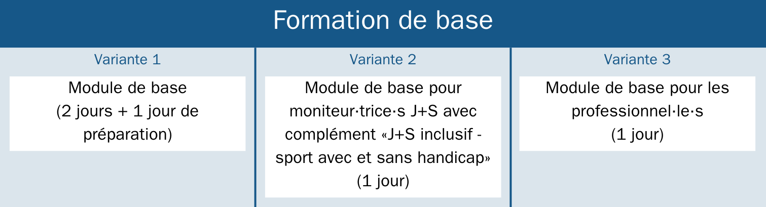 Dans le module de base, tu acquerras les connaissances fondamentales sur différents profils de handicap et leurs répercussions sur le sport. Tu te familiariseras avec ta fonction d'assistant·e moniteur·trice et les principales situations d'urgence, et tu seras sensibilisé·e au thème «Relations, limites et abus».Suivant les connaissances préalables, le module de base peut être suivi sous trois formes différentes, qui permettent toutes de prolonger la reconnaissance de moniteur·trice J+S: